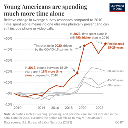 arrow-up11arrow-down1external-linkYoung Americans spend much more time alone than they did fifteen years ago | 4 hours to 6 daily, biggest increase in any groupplus-squareourworldindata.orgcm0002@lemmy.world · 10 days agomessage-square0fedilink