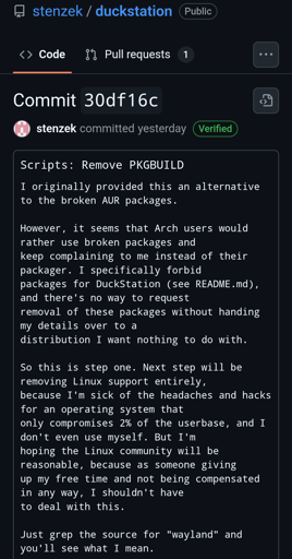 arrow-up1720arrow-down1imageDuckstation(one of the most popular PS1 Emulators) dev plans on eventually dropping Linux support due to Linux users, especially Arch Linux users.reddthat.comPro@reddthat.com to Technology@lemmy.worldEnglish · 3 months agomessage-square422fedilinkfile-text