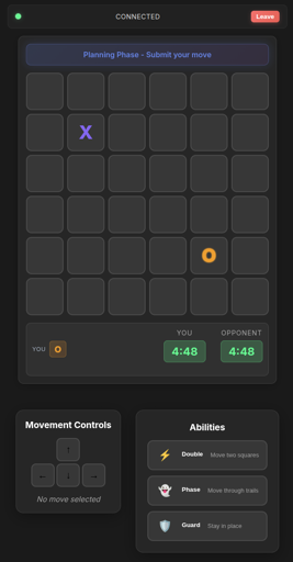 Kewbash is a tactical grid combat game where two players battle on a 6×6 board. The players take turns at the same time. The game involves risk taking and psychology, trying to predict your opponent’s moves while not causing a draw. It’s inspired by games like Tron and Rock Paper Scissors.
