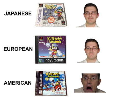 As someone pointed out, they are actually not the same size. I was mentioning the grooves being part of the “everything needs to look bigger and meaner in USA”. As part of the whole marketing strategy that still goes on to this day. E.g. In kirby game covers in the US he looks angry.