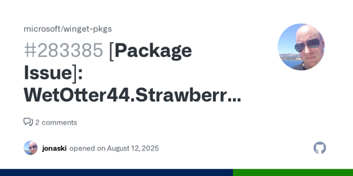 The source code repository and releases from https://codeberg.org/WetOtter44/StrawberryMusicPlayer that you use as source for these packages are not official. It is an unofficial clone of the official source code repository for Strawberry Music Player (https://github.com/strawberrymusicplayer/strawberry), with misleading releases tagged to the wrong commits. If this was a valid fork, it should be renamed to not misrepresent our community project, and any links should not point to our bug tracker and support forum. The person who uploaded these were given the binary installations files from me for testing purposes, he has since proven willing to harm the project, I won’t share his real name, but as you can see by the profile on codeberg he is anonymous for these reasons. He may upload releases containing malicious executables. The official Windows releases for Strawberry Music Player are given to users on request, I do not want it included in a package manager where users can install Strawberry Music Player without any information on how to fund the project.First part valid, but last sentence lol. Open source go brrrr.